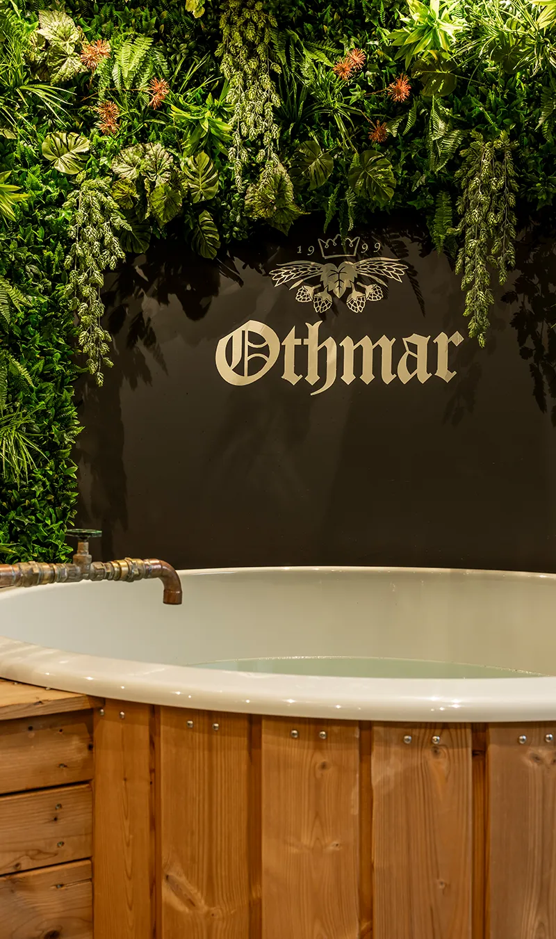 Wij verwerkten hop in de wand — de plant die aan de basis staat van elk biertje — en brachten koperen details aan, geïnspireerd op de koperen vaten en brouwwerktuigen van het merk. Het resultaat is een wand die vertelt wie Othmar is, zonder dat er een woord aan te pas komt.