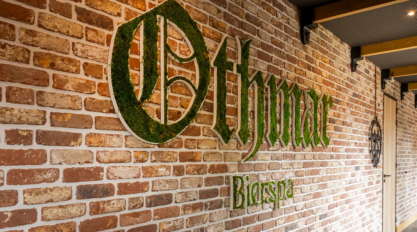 De Bierspa van Othmar Bier in Ootmarsum vroeg om een groencreatie die het verhaal van het merk vertelt. Wij verwerkten hop in de groene wand — de plant waarvan bier wordt gebrouwen — en voegden koperen details toe, geïnspireerd op de koperen vaten en brouwwerktuigen. Het resultaat is een wand die niet alleen prachtig oogt, maar ook echt iets zegt over wie Othmar is.